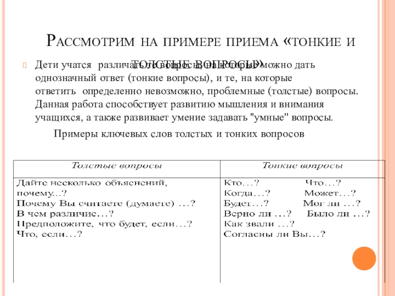 Дети учатся различать те вопросы, на которые можно дать однозначный ответ (тонкие вопросы), и те, на которые ответить определенно невозможно, проблемные (толстые) вопросы. Данная работа способствует развитию мышления и внимания учащихся, а также развивает умение задавать ''умные'' вопросы.