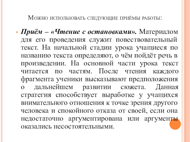 проведения служит повествовательный текст. На начальной стадии урока учащиеся по названию текста определяют, о чём пойдёт речь в произведении. На основной части урока текст читается по частям. После чтения каждого фрагмента ученики высказывают предположения о дальнейшем развитии сюжета. Данная стратегия способствует выработке у учащихся внимательного отношения к точке зрения другого человека и спокойного отказа от своей, если она недостаточно аргументирована или аргументы оказались несостоятельными.