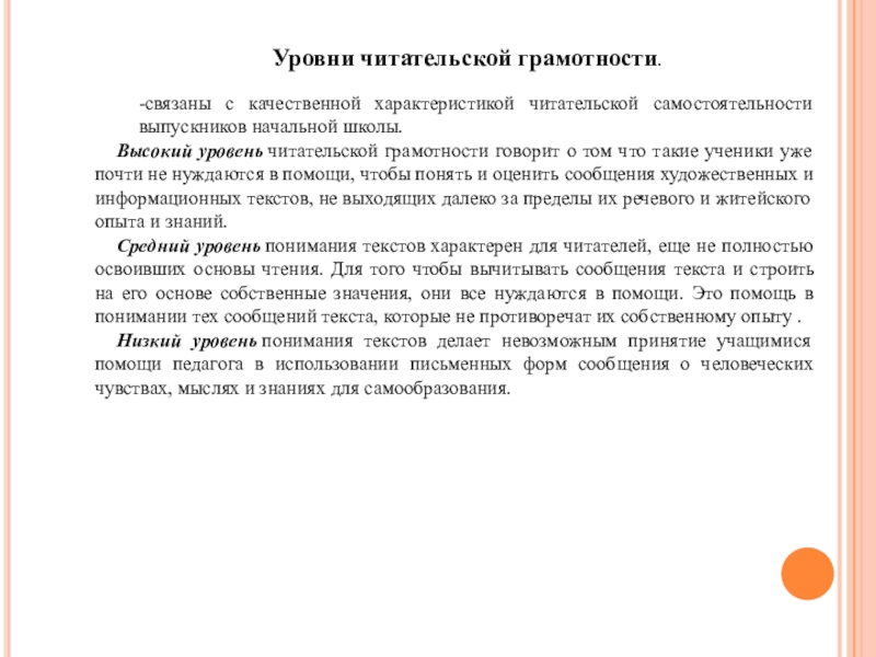 уровень читательской грамотности говорит о том что такие ученики уже почти не нуждаются в помощи, чтобы понять и оценить сообщения художественных и информационных текстов, не выходящих далеко за пределы их речевого и житейского опыта и знаний.