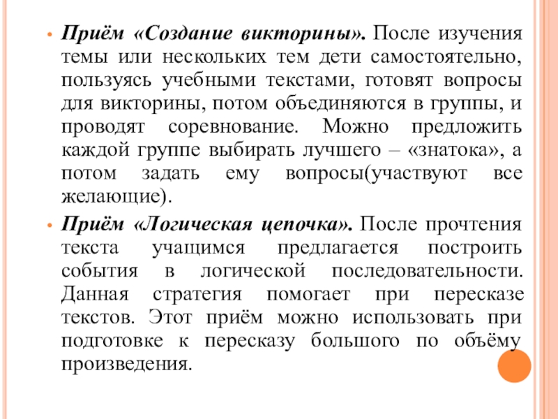 Приём «Логическая цепочка». После прочтения текста учащимся предлагается построить события в логической последовательности. Данная стратегия помогает при пересказе текстов. Этот приём можно использовать при подготовке к пересказу большого по объёму произведения.