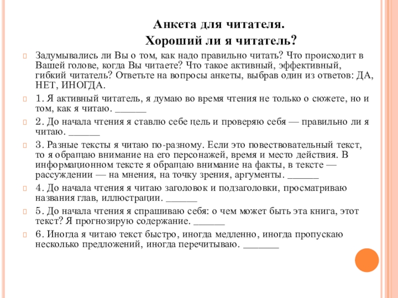 Задумывались ли Вы о том, как надо правильно читать? Что происходит в Вашей голове, когда Вы читаете? Что такое активный, эффективный, гибкий читатель? Ответьте на вопросы анкеты, выбрав один из ответов: ДА, НЕТ, ИНОГДА.