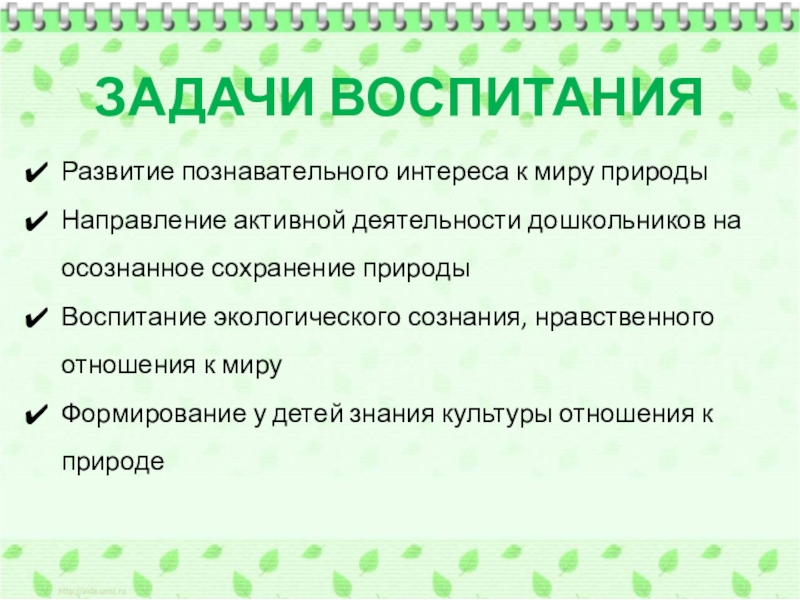 Задачи воспитанияРазвитие познавательного интереса к миру природыНаправление активной деятельности дошкольников на осознанное сохранение природыВоспитание экологического сознания, нравственного