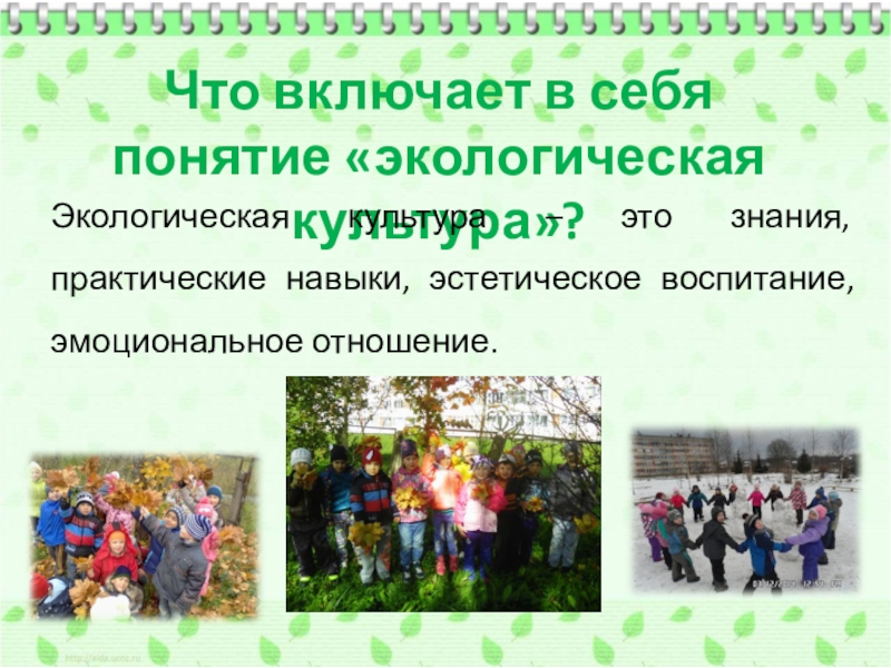 Что включает в себя понятие «экологическая культура»?Экологическая культура – это знания, практические навыки, эстетическое воспитание, эмоциональное отношение.