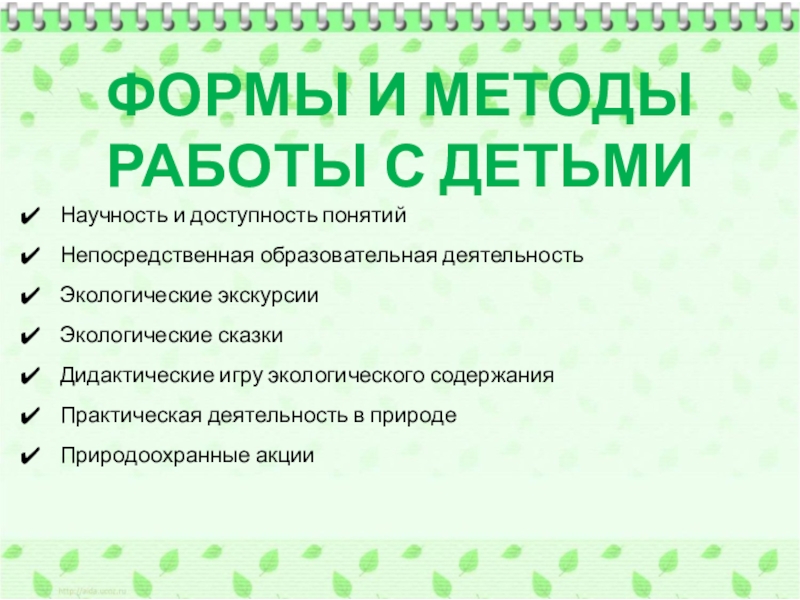 Формы и методы работы с детьмиНаучность и доступность понятийНепосредственная образовательная деятельностьЭкологические экскурсииЭкологические сказкиДидактические игру экологического содержанияПрактическая деятельность
