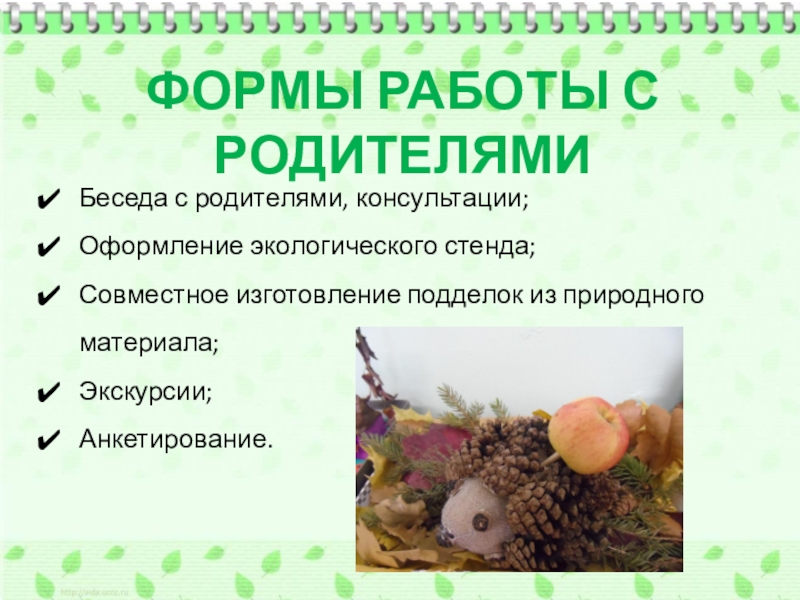 Формы Работы с родителямиБеседа с родителями, консультации;Оформление экологического стенда;Совместное изготовление подделок из природного материала;Экскурсии;Анкетирование.