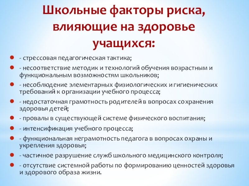 Школьные факторы риска, влияющие на здоровье учащихся: