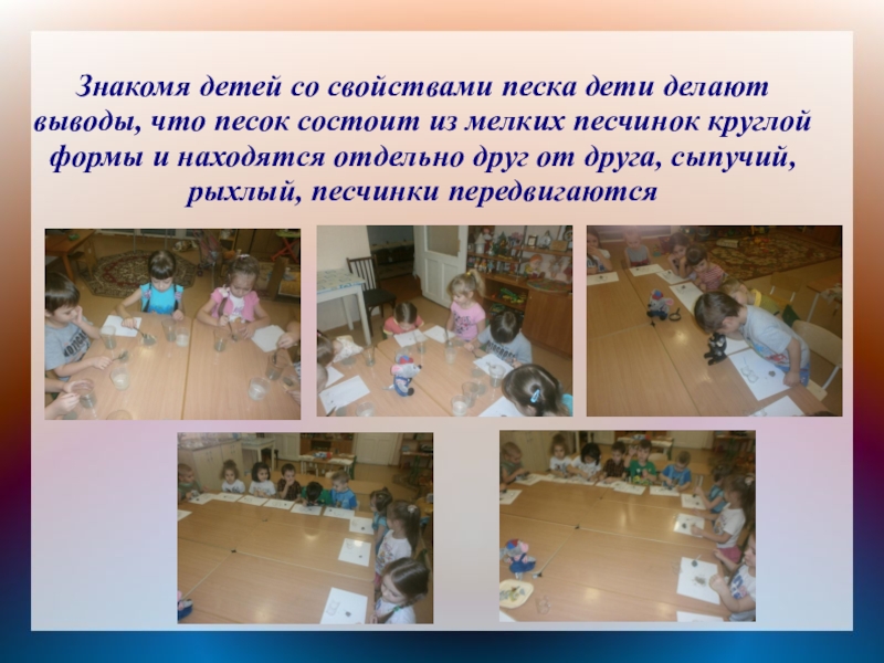 Слайд 21Знакомя детей со свойствами песка дети делают выводы, что песок состоит