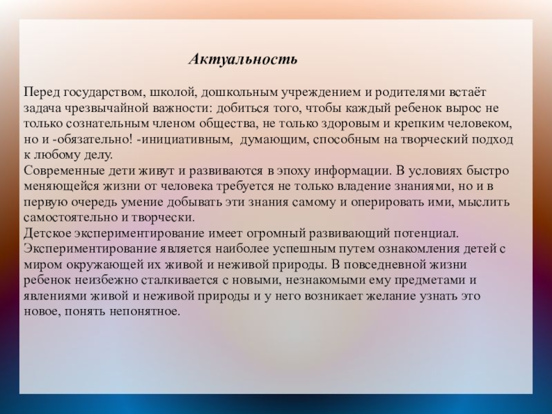 Перед государством, школой, дошкольным учреждением и родителями встаёт задача чрезвычайной важности: добиться того, чтобы каждый ребенок вырос не только сознательным членом общества, не только здоровым и крепким человеком, но и -обязательно! -инициативным, думающим, способным на творческий подход к любому делу.