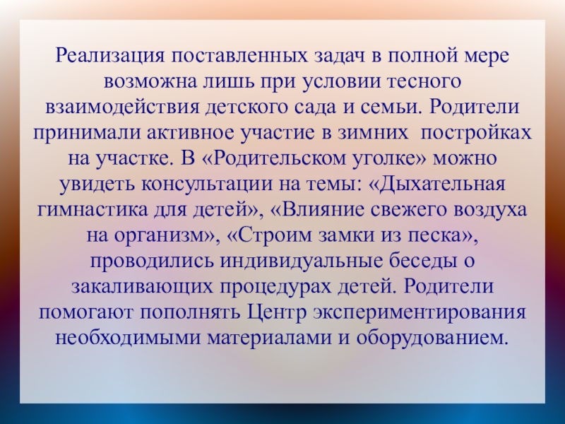 взаимодействия детского сада и семьи. Родители принимали активное участие в зимних постройках на участке. В «Родительском уголке» можно увидеть консультации на темы: «Дыхательная гимнастика для детей», «Влияние свежего воздуха на организм», «Строим замки из песка», проводились индивидуальные беседы о закаливающих процедурах детей. Родители помогают пополнять Центр экспериментирования необходимыми материалами и оборудованием.
