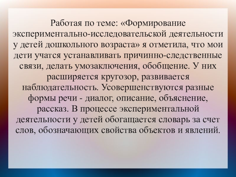 Слайд 23Работая по теме: «Формирование экспериментально-исследовательской деятельности у детей дошкольного возраста» я