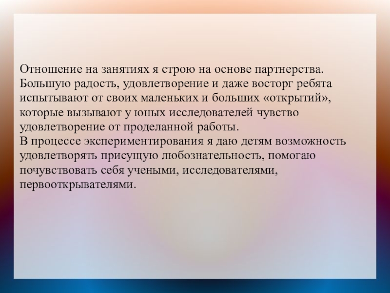 Слайд 9Отношение на занятиях я строю на основе партнерства. Большую радость, удовлетворение
