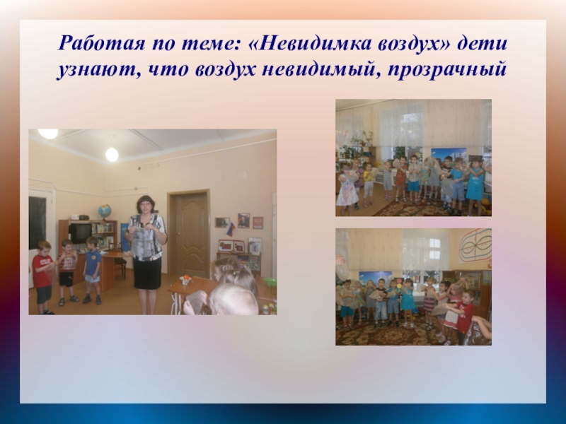Слайд 17Работая по теме: «Невидимка воздух» дети узнают, что воздух невидимый, прозрачный