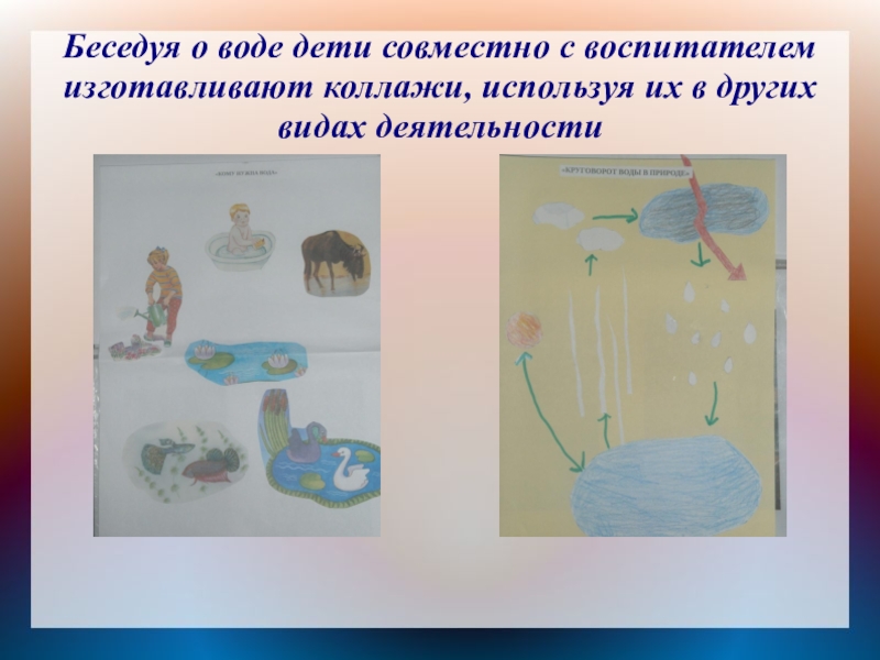 Слайд 10Беседуя о воде дети совместно с воспитателем изготавливают коллажи, используя их
