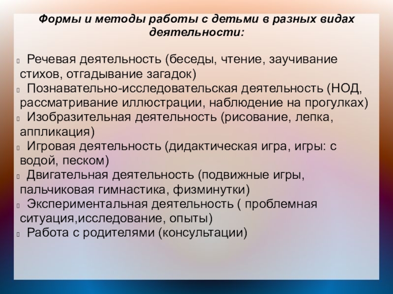 Слайд 7Формы и методы работы с детьми в разных видах деятельности: