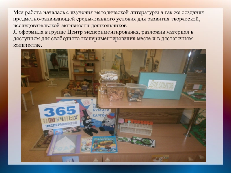 Я оформила в группе Центр экспериментирования, разложив материал в доступном для свободного экспериментирования месте и в достаточном количестве.