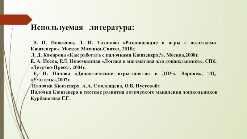 Л. Д. Комарова «Как работать с палочками Кюизенера?», Москва,2008г.
