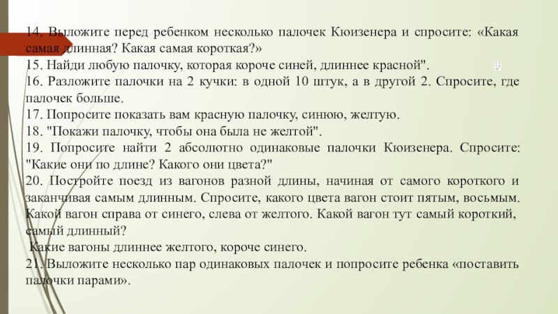 19. Попросите найти 2 абсолютно одинаковые палочки Кюизенера. Спросите: "Какие они по длине? Какого они цвета?"