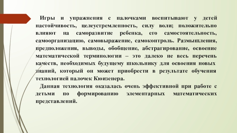 воли; положительно влияют на саморазвитие ребенка, его самостоятельность, самоорганизацию, самовыражение, самоконтроль. Размышления, предположения, выводы, обобщение, абстрагирование, освоение математической терминологии – это далеко не весь перечень качеств, необходимых будущему школьнику для освоения новых знаний, который он может приобрести в результате обучения технологией палочек Кюизенера.