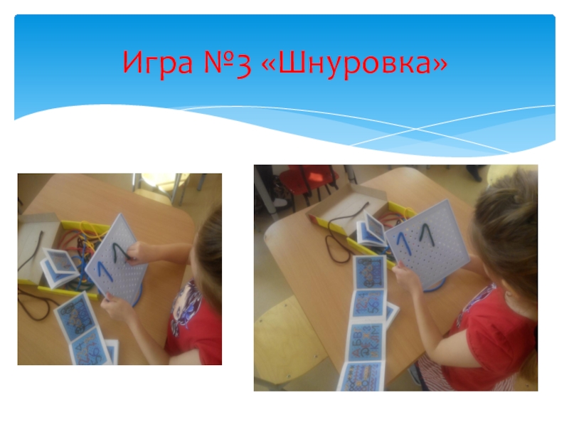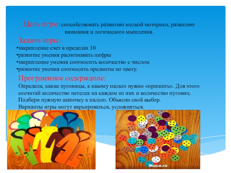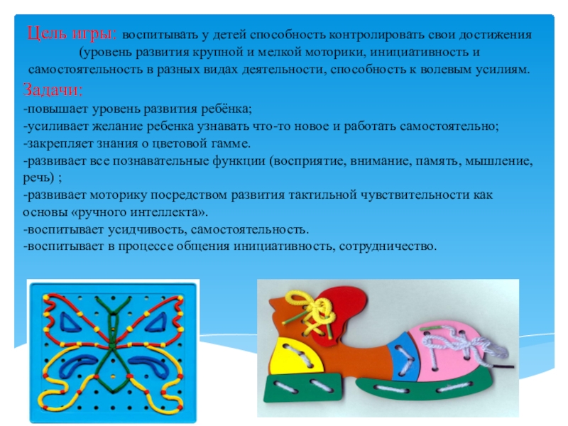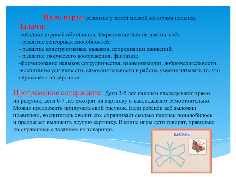 Программное содержание: Дети 3-5 лет палочки накладывают прямо на рисунок, дети 6-7 лет смотрят на картинку и выкладывают самостоятельно. Можно предложить придумать свой рисунок. Если ребёнок всё выложил правильно, воспитатель хвалит его, спрашивает сколько палочек понадобилось и предлагает выложить другую картинку. В конце игры дети говорят, правильно ли справились с заданием их товарищи.
