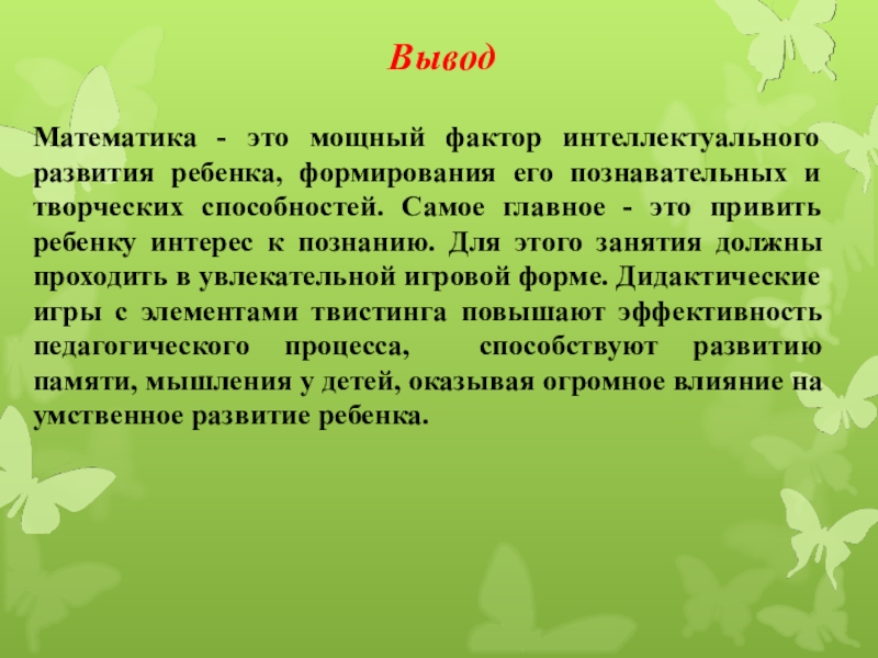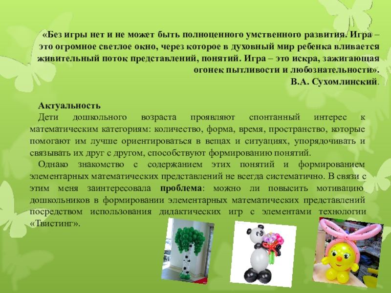 Однако знакомство с содержанием этих понятий и формированием элементарных математических представлений не всегда систематично. В связи с этим меня заинтересовала проблема: можно ли повысить мотивацию дошкольников в формировании элементарных математических представлений посредством использования дидактических игр с элементами технологии «Твистинг».
