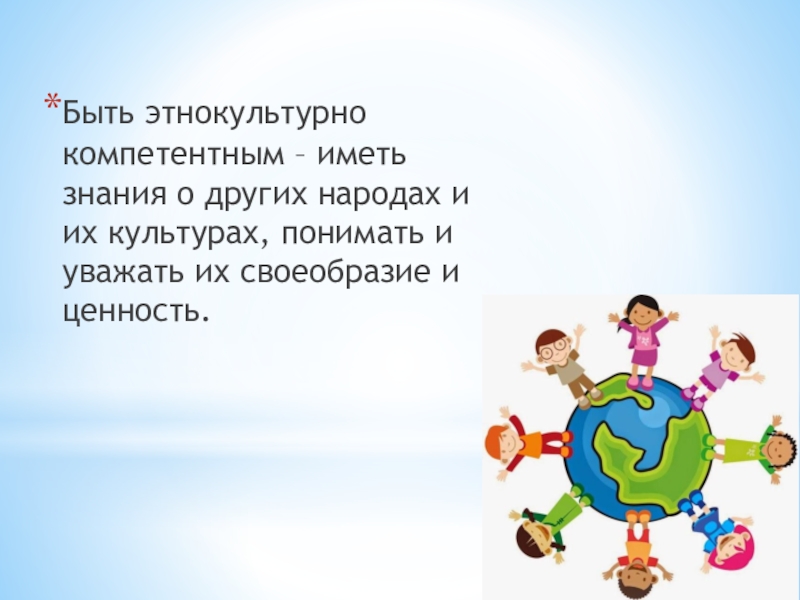 Быть этнокультурно компетентным – иметь знания о других народах и их культурах, понимать и уважать их