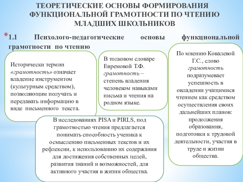 По мнению Ковалевой Г.С., слово грамотность подразумевает успешность в овладении учащимися чтением как средством осуществления своих дальнейших планов: продолжения образования, подготовки к трудовой деятельности, участия в труде и жизни общества.