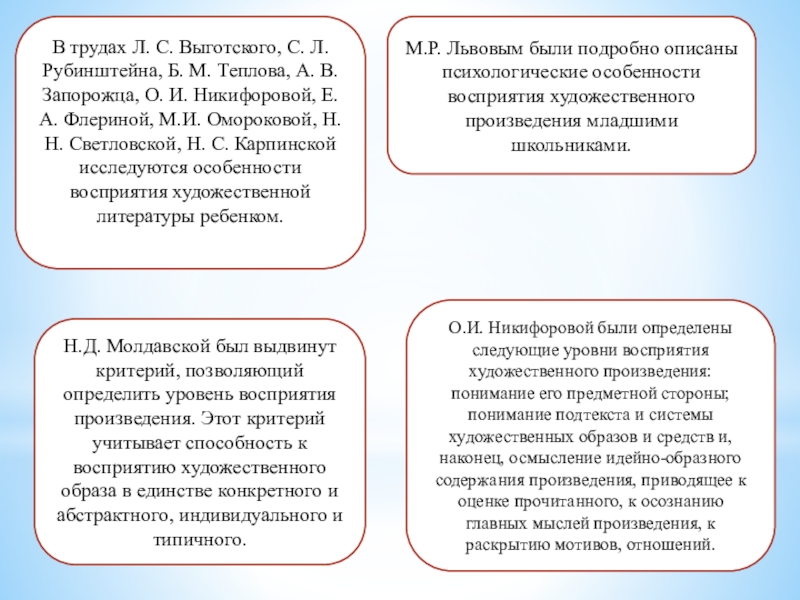 М.Р. Львовым были подробно описаны психологические особенности восприятия художественного произведения младшими школьниками.