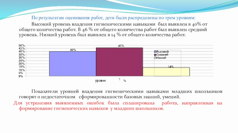 уровень владения гигиеническими навыками был выявлен в 40% от общего количества работ. В 46 % от общего количества работ был выявлен средний уровень. Низкий уровень был выявлен в 14 % от общего количества работ.