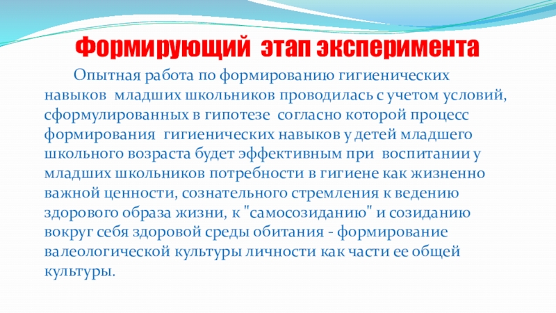 проводилась с учетом условий, сформулированных в гипотезе согласно которой процесс формирования гигиенических навыков у детей младшего школьного возраста будет эффективным при воспитании у младших школьников потребности в гигиене как жизненно важной ценности, сознательного стремления к ведению здорового образа жизни, к "самосозиданию" и созиданию вокруг себя здоровой среды обитания - формирование валеологической культуры личности как части ее общей культуры.