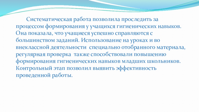 Слайд 13 Систематическая работа позволила проследить за процессом формирования у учащихся гигиенических навыков.