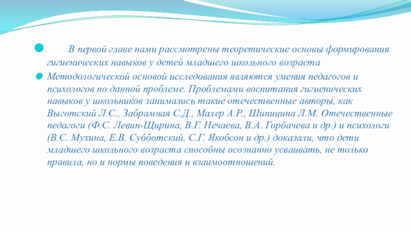 Слайд 6 В первой главе нами рассмотрены теоретические основы формирования гигиенических навыков у
