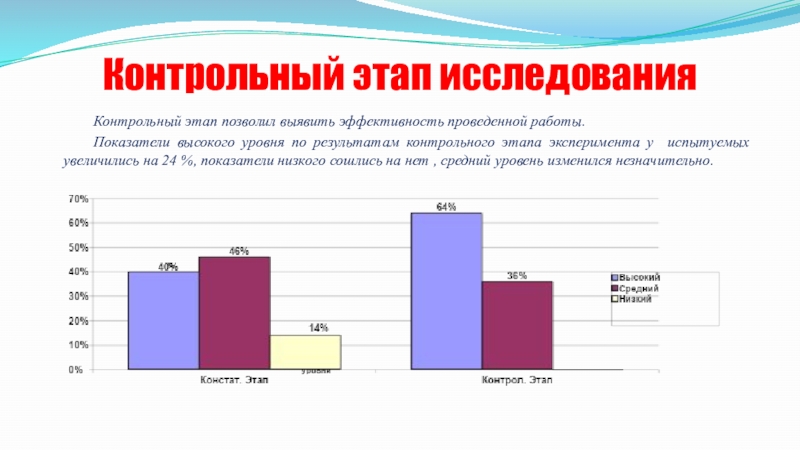 по результатам контрольного этапа эксперимента у испытуемых увеличились на 24 %, показатели низкого сошлись на нет , средний уровень изменился незначительно.