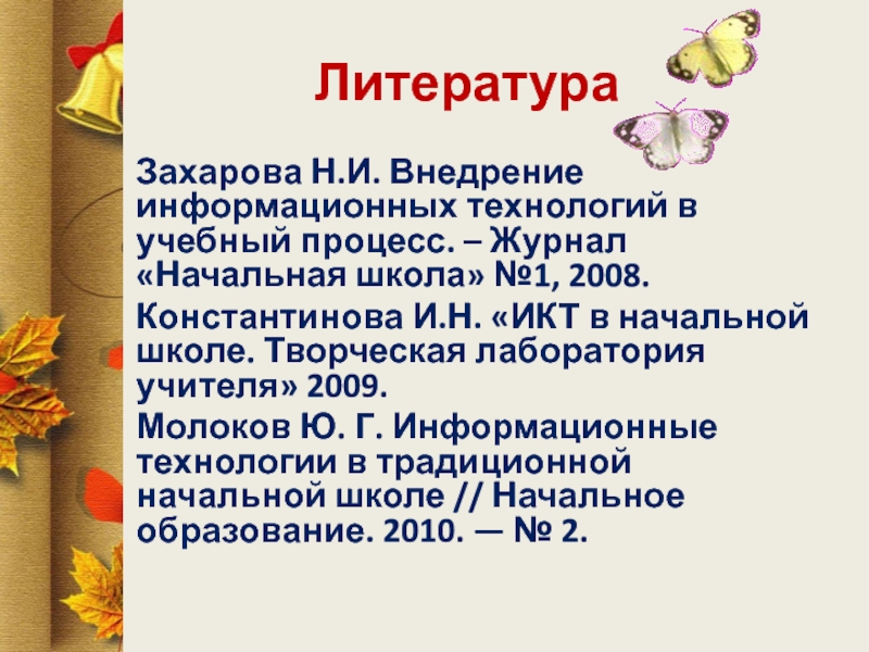 Молоков Ю. Г. Информационные технологии в традиционной начальной школе // Начальное образование. 2010. — № 2.