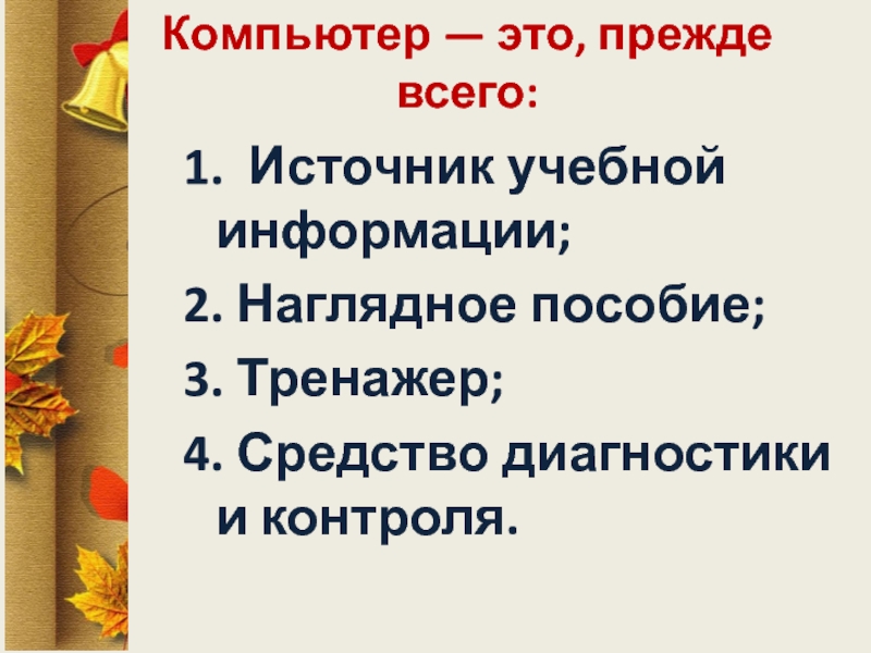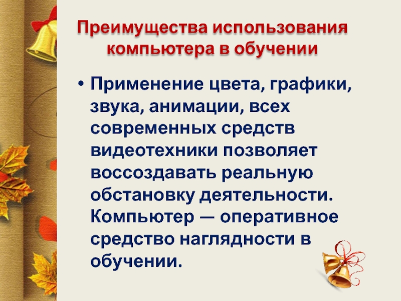 средств видеотехники позволяет воссоздавать реальную обстановку деятельности. Компьютер — оперативное средство наглядности в обучении.