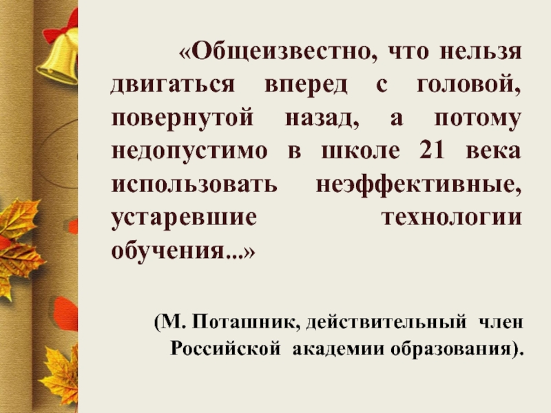с головой, повернутой назад, а потому недопустимо в школе 21 века использовать неэффективные, устаревшие технологии обучения...»