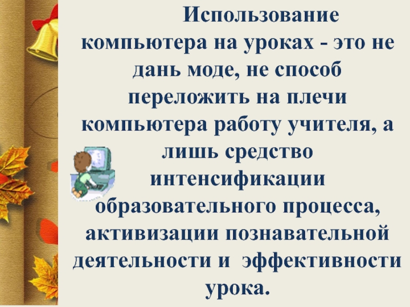 это не дань моде, не способ переложить на плечи компьютера работу учителя, а лишь средство интенсификации образовательного процесса, активизации познавательной деятельности и эффективности урока.