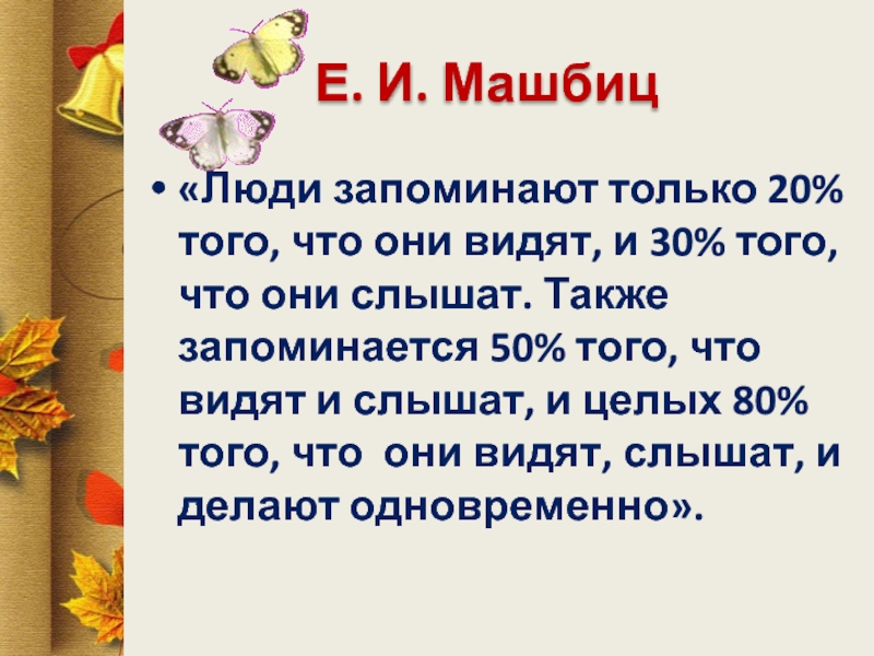 и 30% того, что они слышат. Также запоминается 50% того, что видят и слышат, и целых 80% того, что они видят, слышат, и делают одновременно».