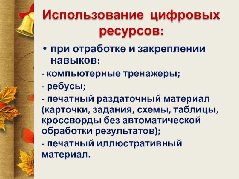 - печатный раздаточный материал (карточки, задания, схемы, таблицы, кроссворды без автоматической обработки результатов);