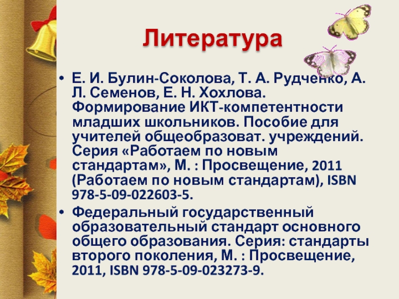 Хохлова. Формирование ИКТ-компетентности младших школьников. Пособие для учителей общеобразоват. учреждений. Серия «Работаем по новым стандартам», М. : Просвещение, 2011 (Работаем по новым стандартам), ISBN 978-5-09-022603-5.