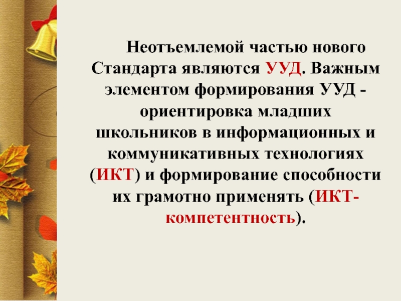 Слайд 3 Неотъемлемой частью нового Стандарта являются УУД. Важным