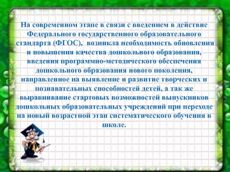 На современном этапе в связи с введением в действие Федерального государственного образовательного стандарта (ФГОС), возникла необходимость обновления и повышения качества дошкольного образования, введения программно-методического обеспечения дошкольного образования нового поколения, направленное на выявление и развитие творческих и познавательных способностей детей, а так же выравнивание стартовых возможностей выпускников дошкольных образовательных учреждений при переходе на новый возрастной этап систематического обучения в школе.