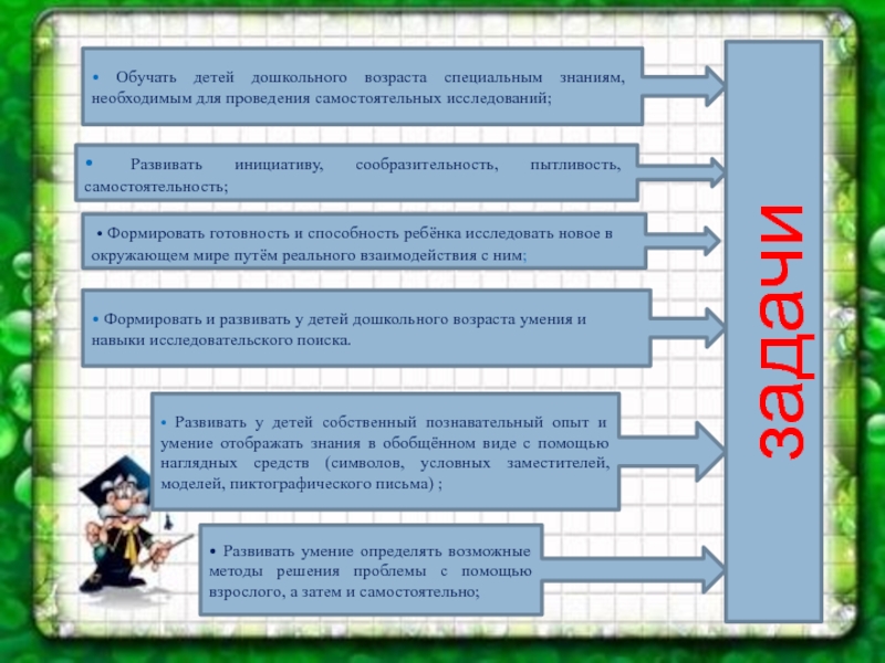 • Обучать детей дошкольного возраста специальным знаниям, необходимым для проведения самостоятельных исследований;