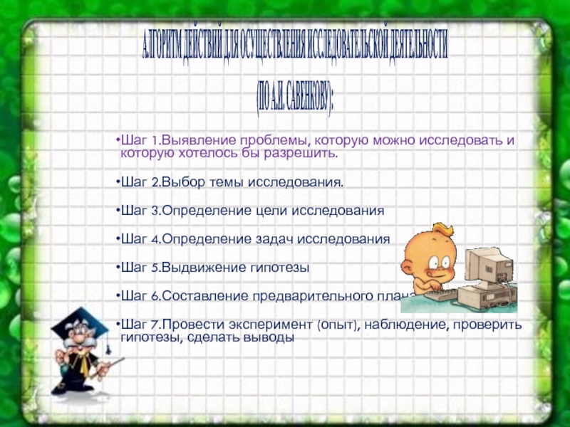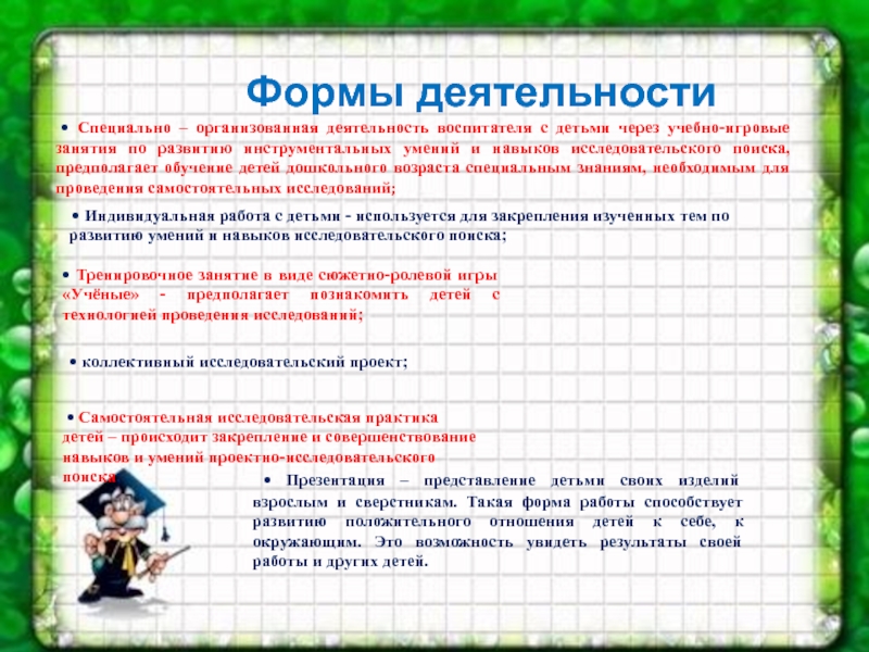 • Индивидуальная работа с детьми - используется для закрепления изученных тем по развитию умений и навыков исследовательского поиска;