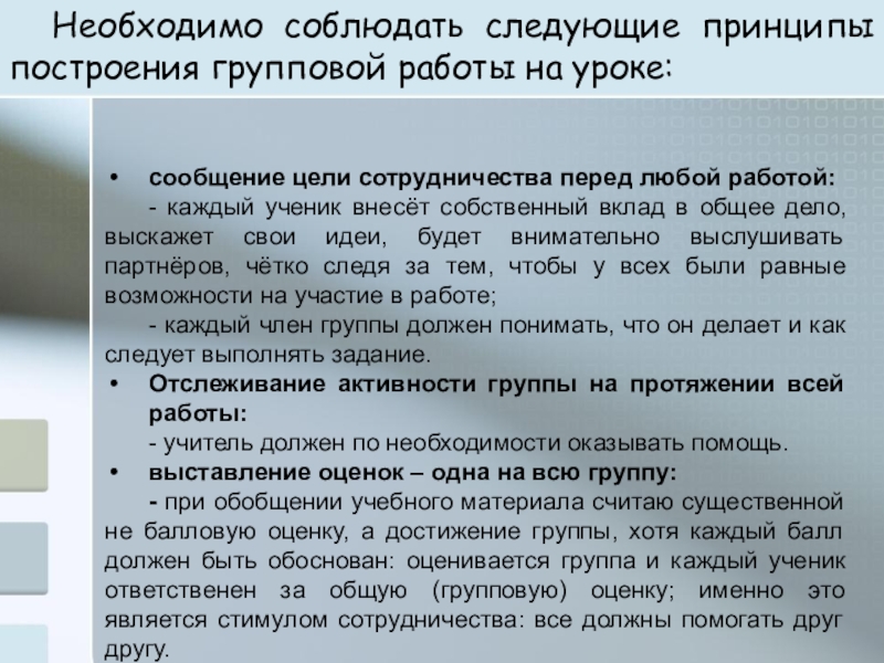 Необходимо соблюдать следующие принципы построения групповой работы на уроке: