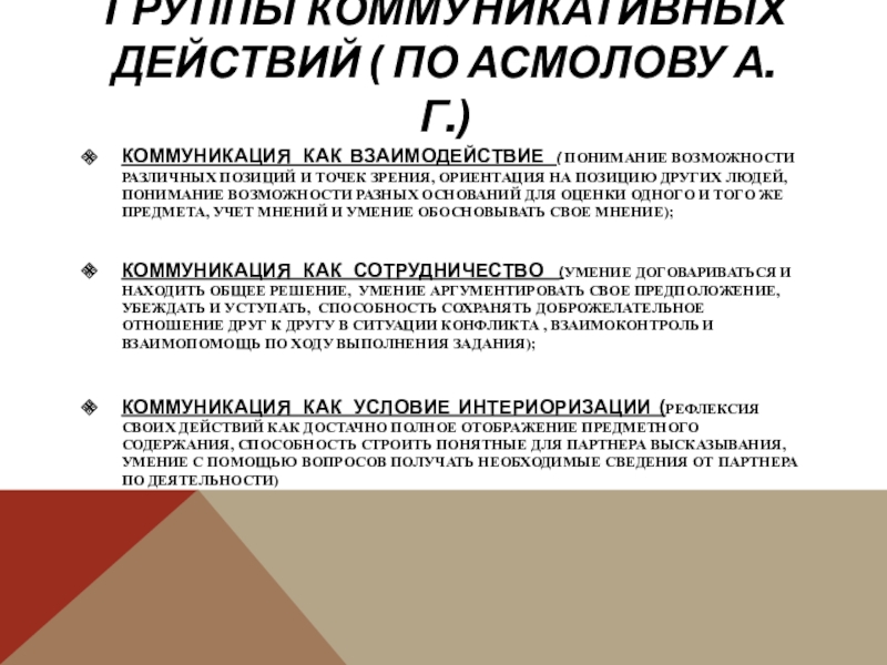 Слайд 3ГРУППЫ КОММУНИКАТИВНЫХ ДЕЙСТВИЙ ( ПО АСМОЛОВУ А.Г.)