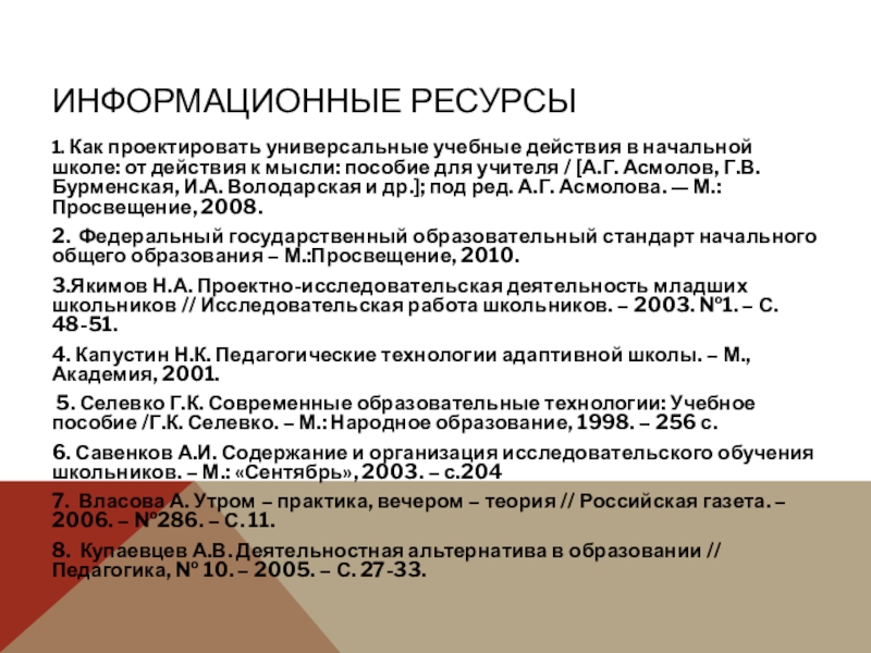 действия к мысли: пособие для учителя / [А.Г. Асмолов, Г.В. Бурменская, И.А. Володарская и др.]; под ред. А.Г. Асмолова. — М.: Просвещение, 2008.
