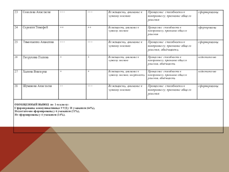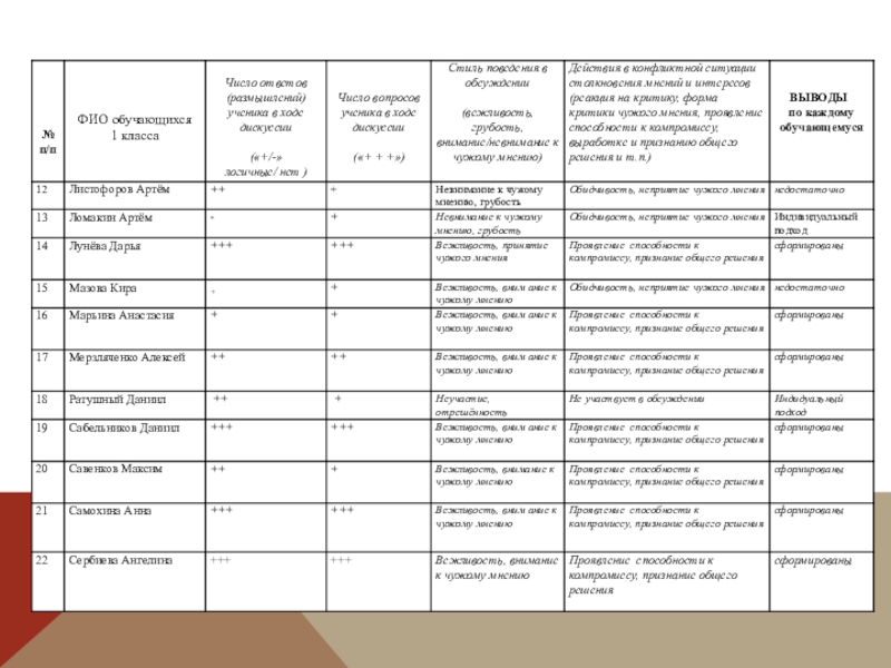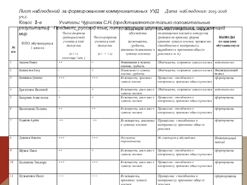 Слайд 13Лист наблюдений за формированием коммуникативных УУД Дата наблюдения: 2015-2016