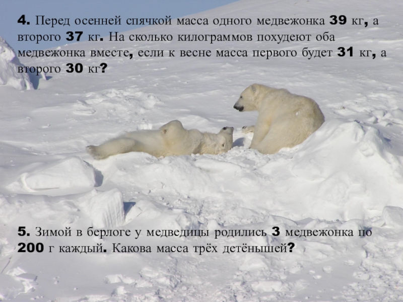 5. Зимой в берлоге у медведицы родились 3 медвежонка по 200 г каждый. Какова масса трёх детёнышей?