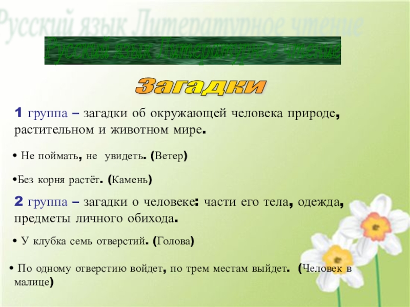 2 группа – загадки о человеке: части его тела, одежда, предметы личного обихода.