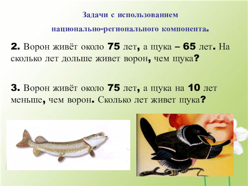 3. Ворон живёт около 75 лет, а щука на 10 лет меньше, чем ворон. Сколько лет живет щука?